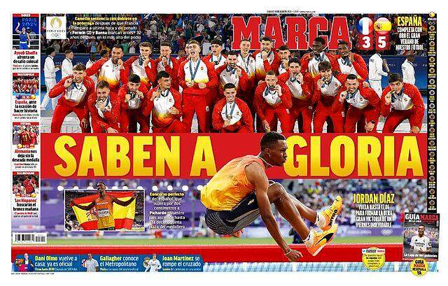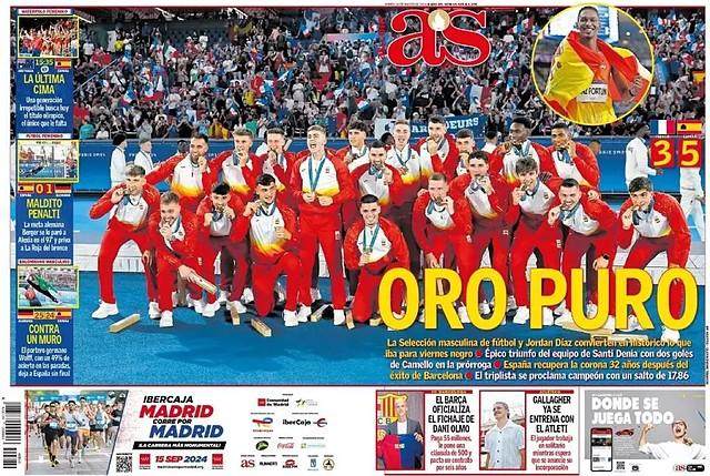 虽然女足留下了遗憾,但一天斩获两金的成绩还是让西班牙各大媒体大加赞颂,尤其是时隔32年再度摘得奥运男足金牌,这一天几乎所有西班牙报纸都在头版最显眼的位置放上男足夺冠的画面。《阿斯》报的文章评论道:“32年后的传承,这批小伙子们以史诗般的美妙表现,当之无愧地赢得了奥运冠军。这场胜利为西班牙过去一年来的非凡足球赛季画上了一个圆满句号。上一次夺得奥运男足金牌的欧洲球队也是西班牙,在1992年的巴塞罗那,如今西班牙亲自完成了这个轮回。“