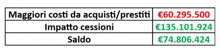 根据Calcio e Finanza的估算,出售操作预计将对2025/26财年预算产生约1.351亿欧元的正面影响。这一数字是通过将实现的资本收益/损失、来自租借的收入(当存在时)、摊销节省(针对永久出售的球员)以及相比于2024/25赛季,离队球员所带来的税前工资节省相加得出的。