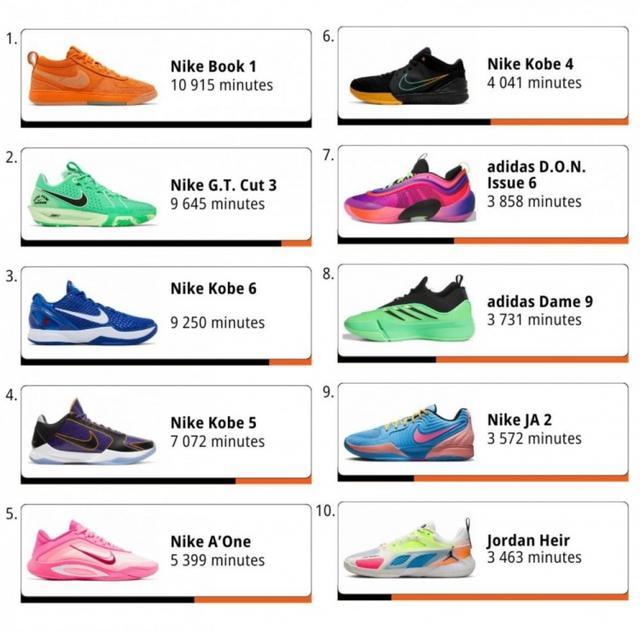 其中布克的签名鞋Book 1排名第一、共计上场时长10915分钟。而科比的三代球鞋也都有上榜,还有利拉德、米切尔以及莫兰特的签名鞋。